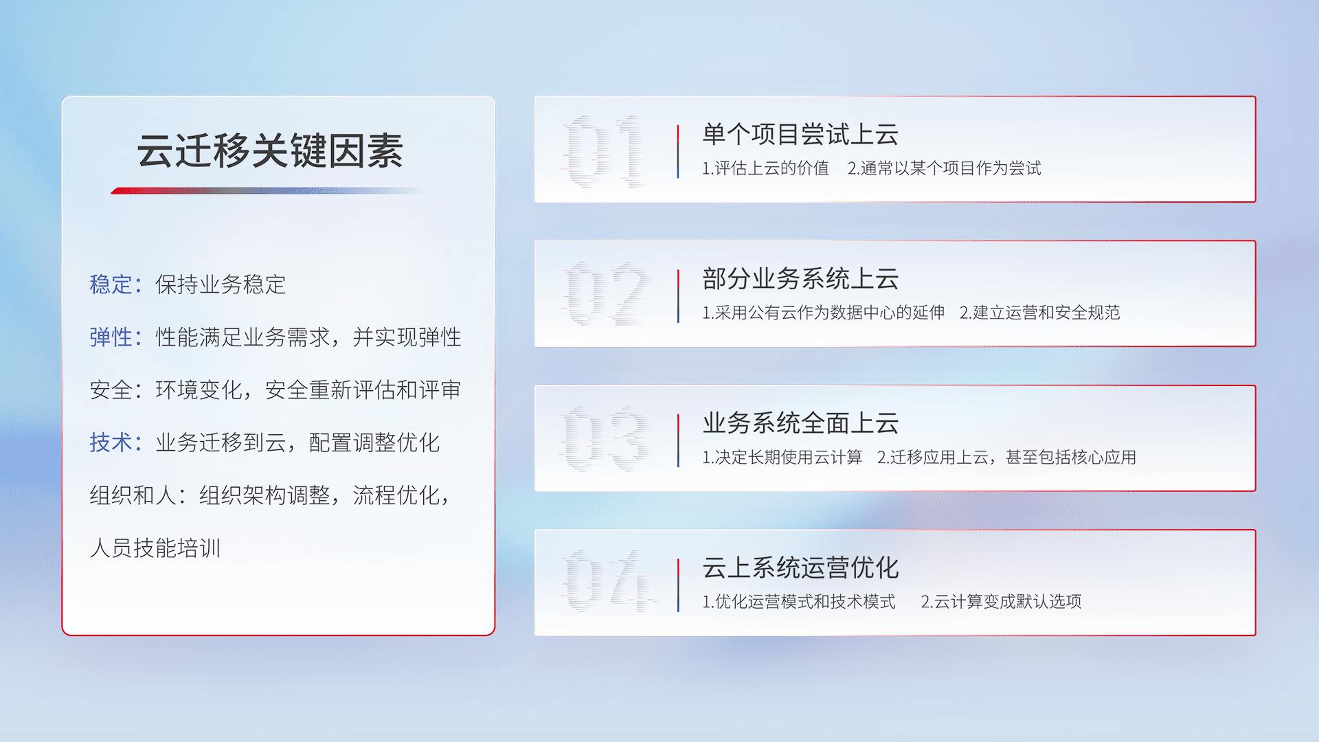 结合实际业务,,,,从规划设计、、、、云平台选型、、、、云原生改造、、、、数据迁移、、、、集成交付,,,迁移全过程为客户识别最佳上云路径,,,做好风险识别管理,,,设计网络架构、、身份权限、、、、安全审计合规、、、操作审计、、日志审计、、、监控告警策略、、、多站点容灾设计等,,对云上基础设施进行整体规划,,提升IT治理水平,,以满足弹性、、高可用、、、、高性能的需求。。