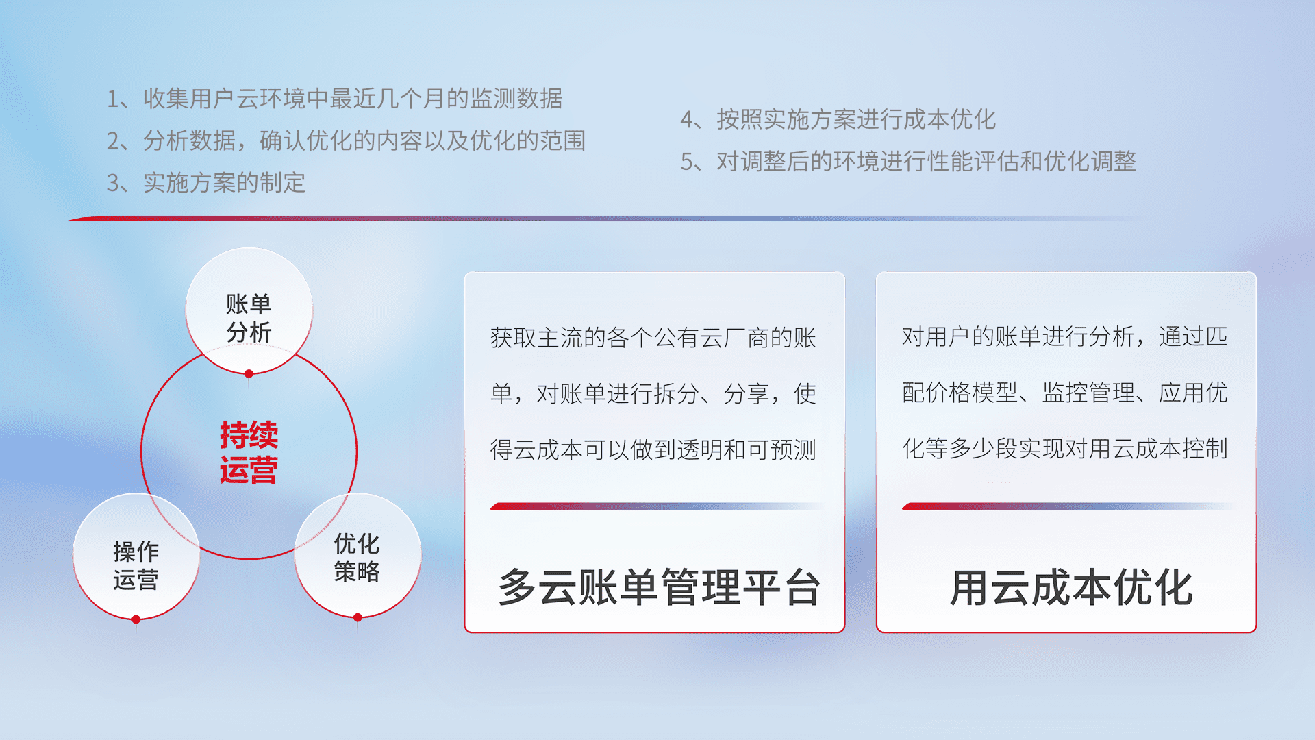 通过多云纳管,,,以统一的资源数据模型把客户的云资源进行抽象和封装,,进而实现对多云资源的统一操作,,,,保障云资源管理的可靠性、、稳定性与可用性。。。。量身定制化运维内容,,,,配置、、、开发运维、、、补丁管理、、备份、、、监控、、认证和访问管理、、审计和日常巡检等,,,,保障在用云过程中的可靠度,,,,稳定度以及高可用率。。。